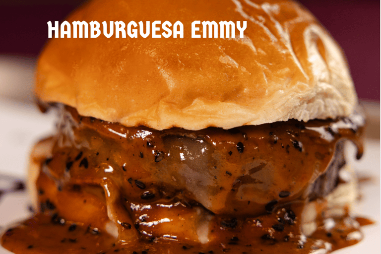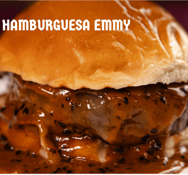Carne madurada 70 días, queso ahumado, cebolla caramelizada y salsa Emmy.